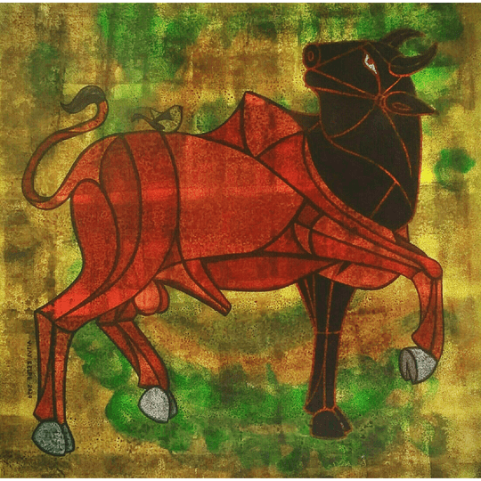 Bull is the subject of my canvas. Strong lines, colors and composition of the contemporary Painting .The dexterity of work expands beyond the traditional style and show up fresh dimension subtly. The bull represents untamed strength and vigor. It represents the manhood and power exerted through unified action. This advancing bull depicts similar vigor are immense dynamism. The colored forms highlight their muscular capacity.