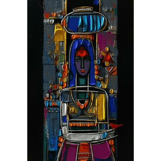 Girish uses a vibrant palette in depicting a youngster lost in the daily grind. There is a jugglery with the human from as the study of head continues in speces unhinged from the subject in dominance. Female paintings with a palette loaded with contrasts. In examining concerns of displacement and its impending impact on the self in relation to the surroundings, his paintings display insecurities of the individual. In the figurative works of Rural Bliss,
