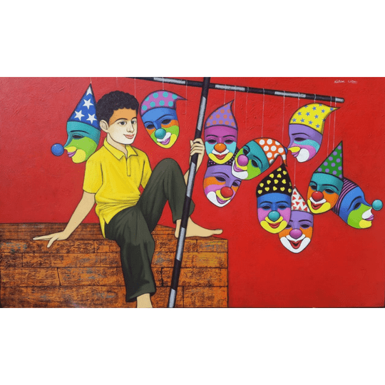 Nitin, though settled in Mumbai, hails from rural area and knows well that many poor families rely on the labours of their children. In the rural area, children perform labour on their farm and even sell allied farm products like fruits, vegetables, flowers etc apart from other bazaar items; it may be the case of self-employment, nonetheless it is a form of ‘child labor’. Nitin has captured the children, selling various items, on his acrylic canvases; the boys and girls selling custard apples, balloons, masks, bananas, flutes are shown wearing multi-coloured dresses; girls are shown wearing the ghaghara and full length tops, boys with shirt & short pants. The textured background with bold swathes of colour, round simplified faces of the boys and girls, big eyes looking directly at the viewer and evasive perspective, creates powerful impact and a blend that poised between two visual extremes.