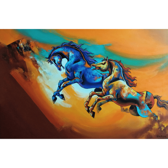 I like to fill my art with vibrant colour scheme. I like to show the game of shades from light to dark. This enlightens my painting. I love to show a signature effect, it differs from painting to painting. One can feel the rhythm, strokes and texture in my art. All elements compliments each other and as well paintings emerge with that energy and positiveness and spirit. I studied Horses and made sketches to bring them live in paintings, he use contemporary colour scheme in paintings. Textures results are simply application of brush strokes. As each layer of colour blends seems communicating with each other, it is playing major role in painting. Use of circular and straight lines ruling their role of grace and rhythm, beauty and connectivity. Background strokes and colours mixing shows horse speed and beauty. It is said that in Vastu Shastra and feng shui, Paintings of Horse brings positivity and prosperity.