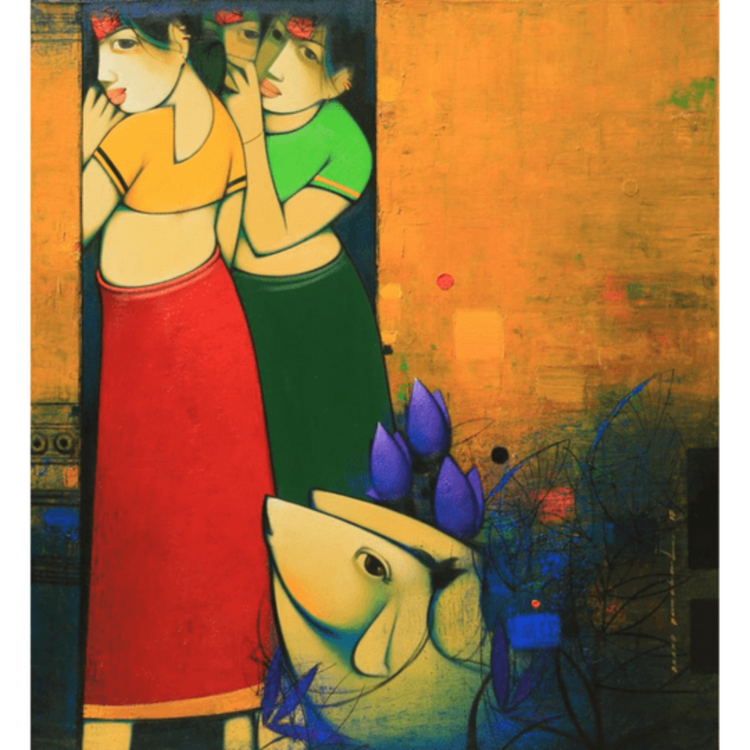 Beauty, boldness, brightness and gorgeousness are some of the trademarks of Anand Panchal’s works. Best known for his figurative artworks, Panchal has over the years developed a unique style of his own, mostly paints Brahmins, and children with lots of innocence in them. Panchal’s paintings are quite narrative, showing the unfolding stories of rural life. In most of his paintings we see the figures enjoying each other’s company. Backgrounds merge with the subject of the painting, one can observe the scripts in the background; animals and birds; group figures, and also painted singularly. Application of colours is smooth and well finished. The colour palette is restricted to reds, blues and oranges. Foreheads are painted with orange or blue, to show the mood. Orange symbolizes spirituality and blue symbolizes calmness and peacefulness. Panchal has painted many panel format works.