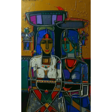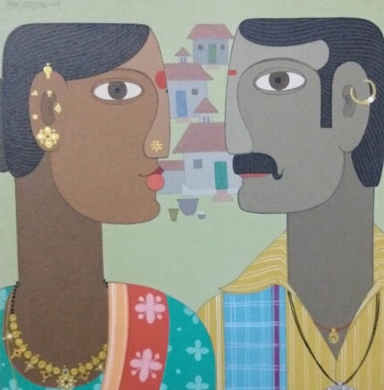 Beauty, boldness, brightness and gorgeousness are some of the trademarks of Anand Panchal’s works. Best known for his figurative artworks, Panchal has over the years developed a unique style of his own, mostly paints Brahmins, and children with lots of innocence in them. Panchal’s paintings are quite narrative, showing the unfolding stories of rural life. In most of his paintings we see the figures enjoying each other’s company. Backgrounds merge with the subject of the painting, one can observe the scripts in the background; animals and birds; group figures, and also painted singularly. Application of colours is smooth and well finished. The colour palette is restricted to reds, blues and oranges. Foreheads are painted with orange or blue, to show the mood. Orange symbolizes spirituality and blue symbolizes calmness and peacefulness. Panchal has painted many panel format works.